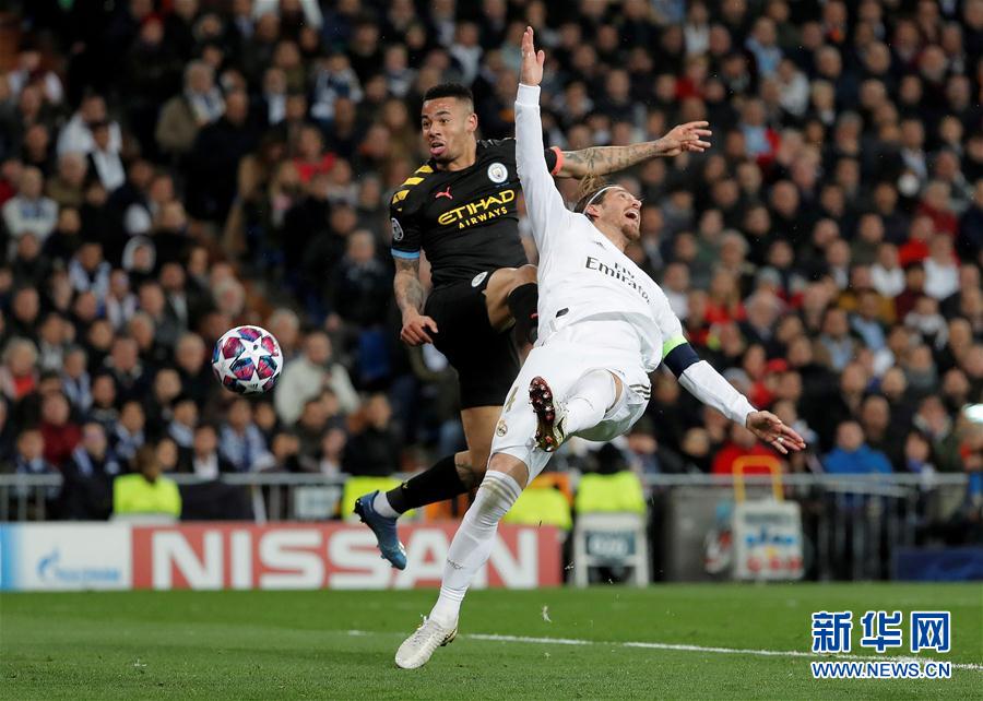2月26日,曼城队球员热苏斯(左)在比赛中头球攻门得分。 当日,在2019-2020赛季欧洲足球冠军联赛八分之一决赛首回合比赛中,西甲皇家马德里队主场以1比2不敌英超曼彻斯特城队。 新华社/路透