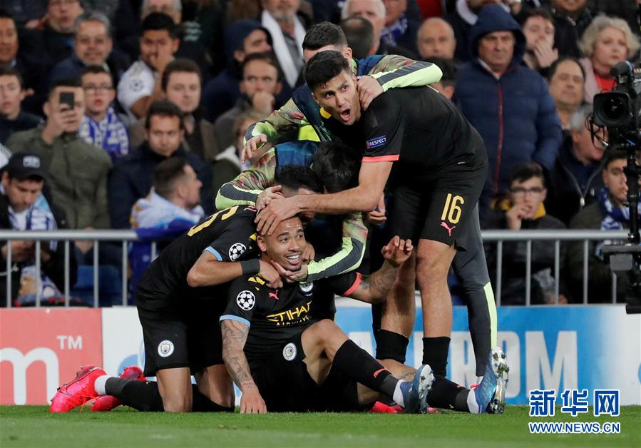 2月26日,曼城队球员热苏斯(下)在进球后和队友庆祝。 当日,在2019-2020赛季欧洲足球冠军联赛八分之一决赛首回合比赛中,西甲皇家马德里队主场以1比2不敌英超曼彻斯特城队。 新华社/路透