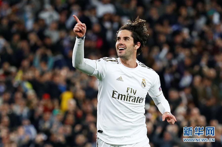 2月26日,皇家马德里队球员伊斯科在进球后庆祝。 当日,在2019-2020赛季欧洲足球冠军联赛八分之一决赛首回合比赛中,西甲皇家马德里队主场以1比2不敌英超曼彻斯特城队。 新华社/路透
