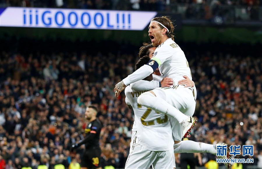 2月26日,皇家马德里队球员伊斯科(上左)在进球后和队友维尼修斯(下)、拉莫斯庆祝。 当日,在2019-2020赛季欧洲足球冠军联赛八分之一决赛首回合比赛中,西甲皇家马德里队主场以1比2不敌英超曼彻斯特城队。 新华社/路透