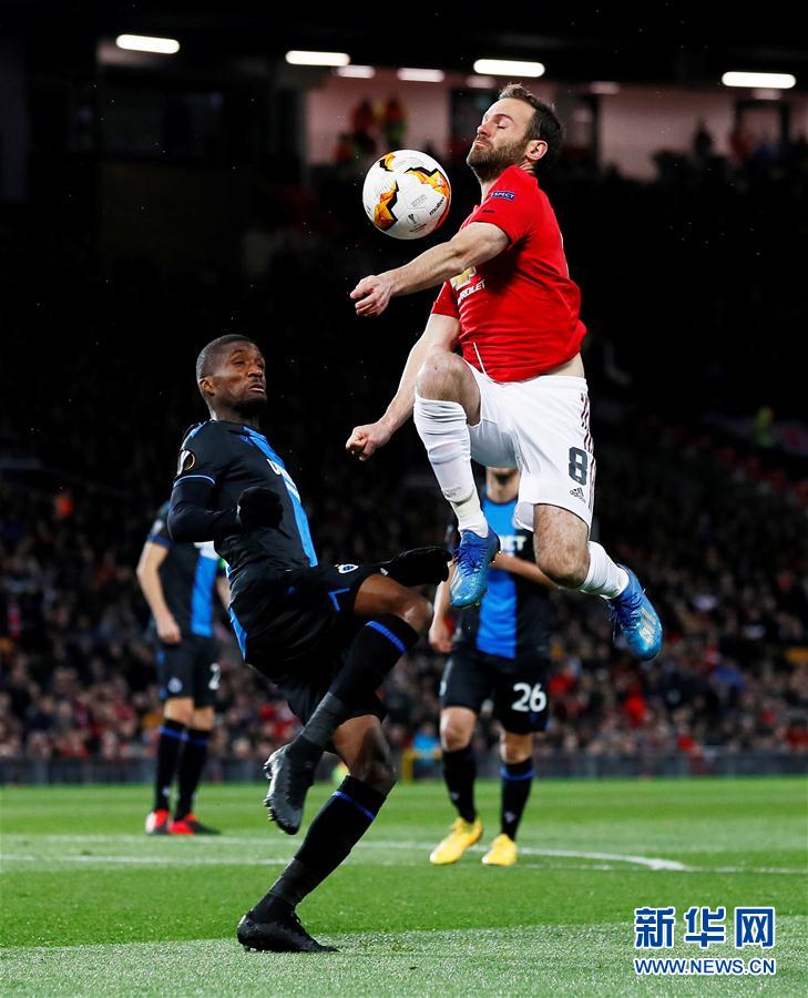 2月27日,曼联队球员马塔(上)在比赛中拼抢。 当日,在比利时布鲁日进行的2019-2020赛季欧罗巴联赛1/16决赛第二回合比赛中,英超曼彻斯特联队主场以5比0战胜比甲布鲁日队,从而以6比1的总比分晋级16强。 新华社/路透