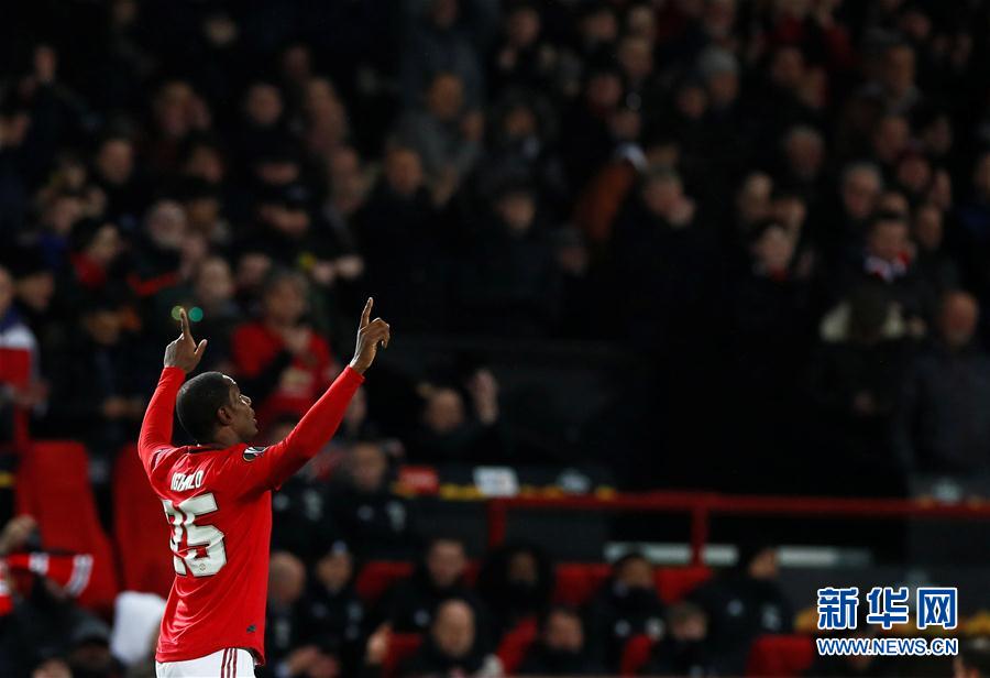 2月27日,曼联队球员伊哈洛在进球后庆祝。 当日,在比利时布鲁日进行的2019-2020赛季欧罗巴联赛1/16决赛第二回合比赛中,英超曼彻斯特联队主场以5比0战胜比甲布鲁日队,从而以6比1的总比分晋级16强。 新华社/路透