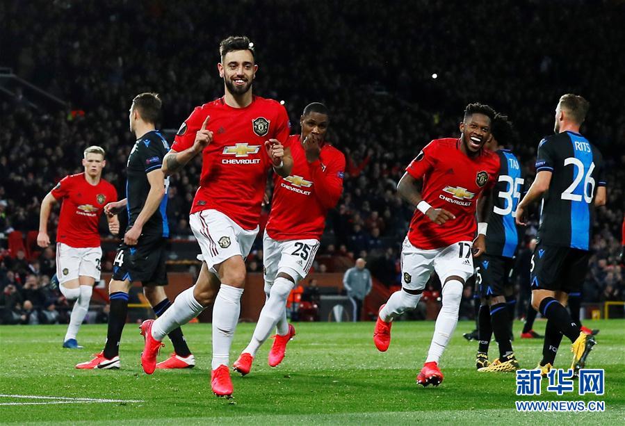2月27日,曼联队球员布鲁诺·费尔南德斯(左三)在进球后庆祝。 当日,在比利时布鲁日进行的2019-2020赛季欧罗巴联赛1/16决赛第二回合比赛中,英超曼彻斯特联队主场以5比0战胜比甲布鲁日队,从而以6比1的总比分晋级16强。 新华社/路透