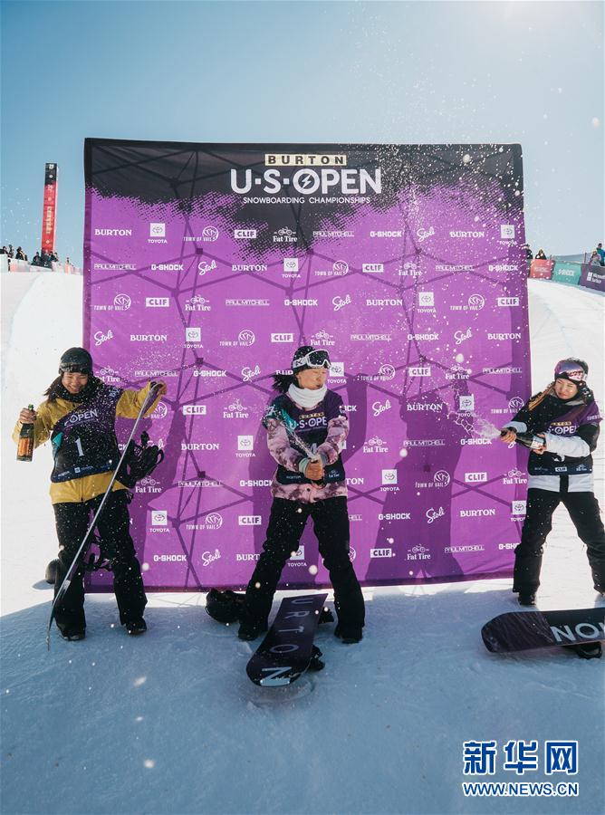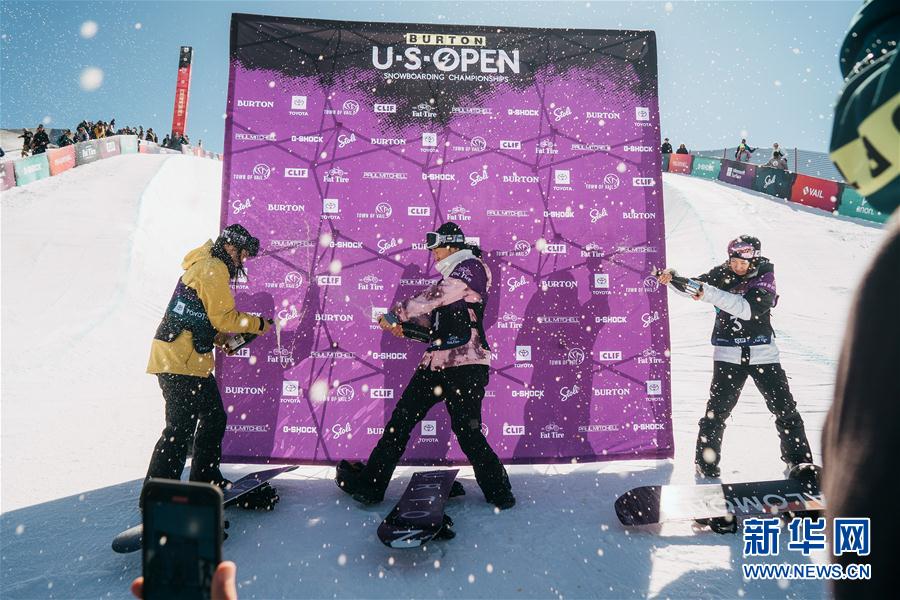 2月29日,中国选手蔡雪桐(中)在颁奖仪式上。 当日,在美国科罗拉多州韦尔滑雪场进行的2020美国公开赛单板滑雪U型场地比赛中,中国运动员蔡雪桐勇夺女子组冠军,这是中国运动员首次获得该赛事金牌。 新华社发(单板滑雪U型场地技巧国家队供图)