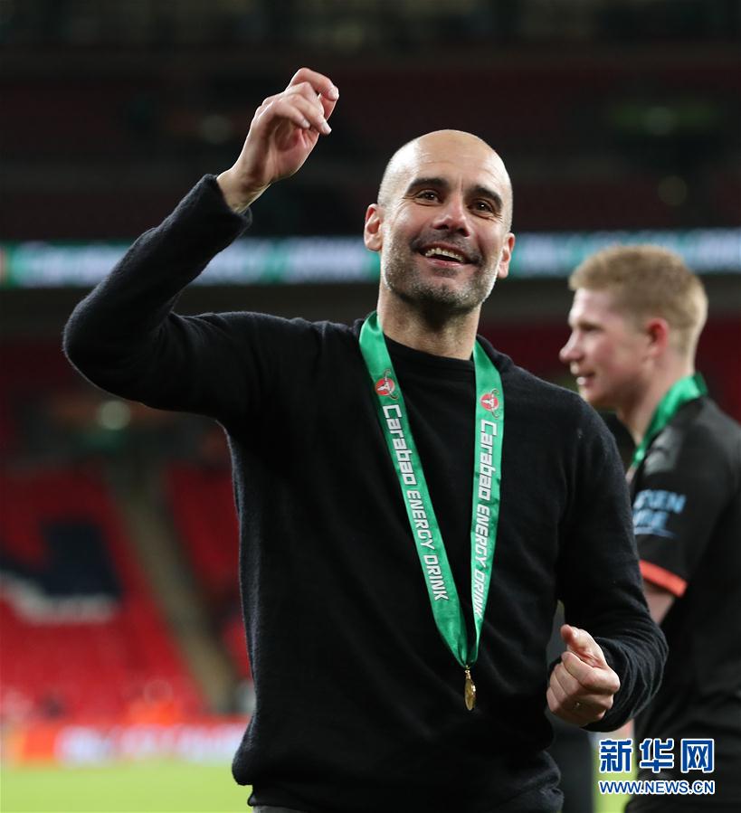 3月1日,曼城队主帅瓜迪奥拉庆祝夺冠。 当日,在2019-2020赛季英格兰足球联赛杯决赛中,曼城队以2比1战胜阿斯顿维拉队,夺得冠军。 新华社发(马修·英佩摄)