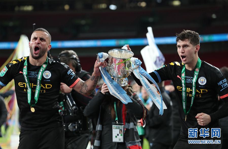 3月1日,曼城队球员沃克(前左)和斯通斯(右)庆祝夺冠。 当日,在2019-2020赛季英格兰足球联赛杯决赛中,曼城队以2比1战胜阿斯顿维拉队,夺得冠军。 新华社发(马修·英佩摄)