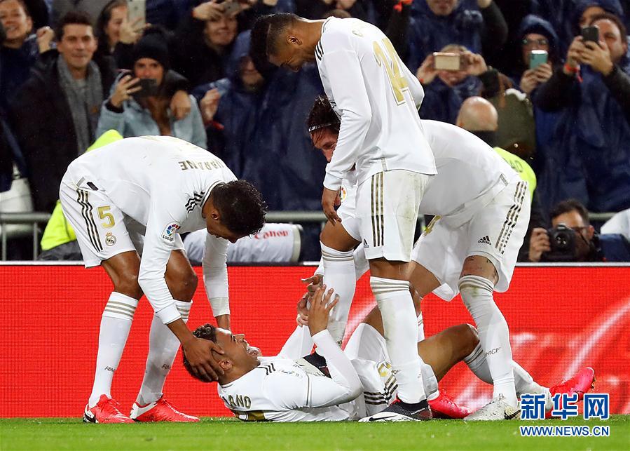3月1日,皇家马德里队球员迪亚斯(下)在进球后和队友庆祝。 当日,在2019-2020赛季西班牙足球甲级联赛第26轮比赛中,皇家马德里队主场以2比0战胜巴塞罗那队。 新华社/路透