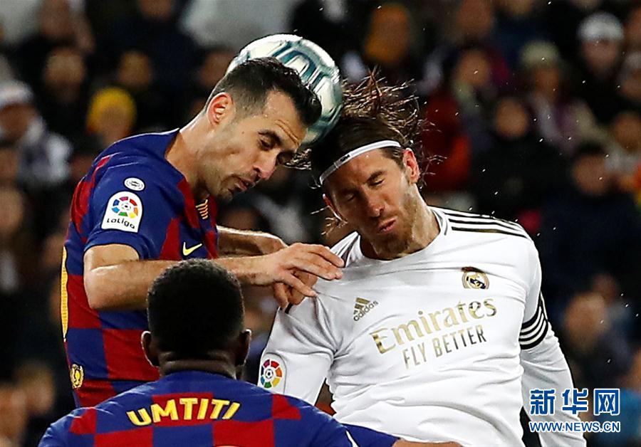 3月1日,皇家马德里队球员拉莫斯(右)和巴塞罗那队球员布斯克茨争顶。 当日,在2019-2020赛季西班牙足球甲级联赛第26轮比赛中,皇家马德里队主场以2比0战胜巴塞罗那队。 新华社/路透