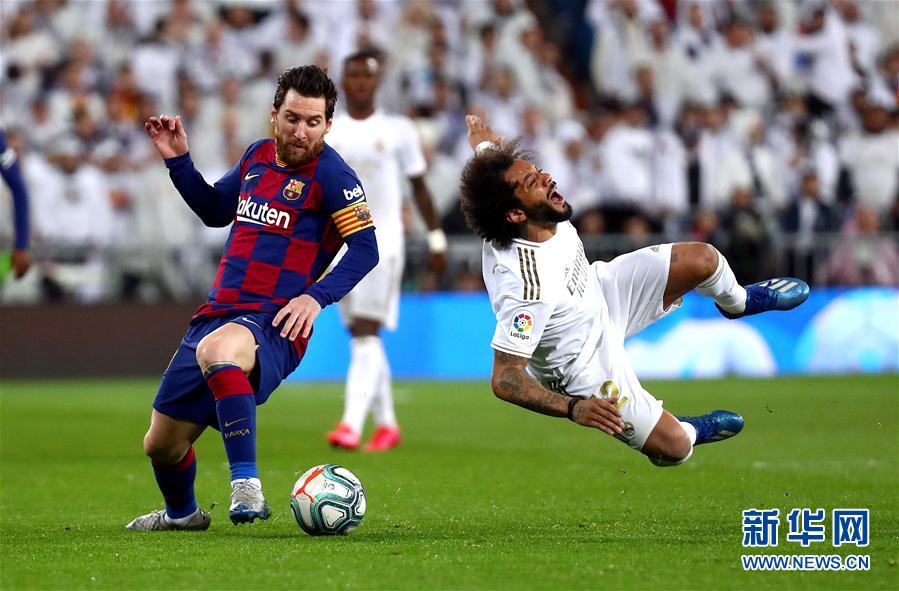 3月1日,皇家马德里队球员马塞洛(右)和巴塞罗那队球员梅西拼抢。 当日,在2019-2020赛季西班牙足球甲级联赛第26轮比赛中,皇家马德里队主场以2比0战胜巴塞罗那队。 新华社/路透