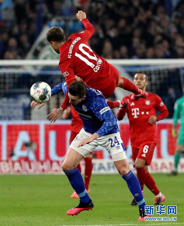 3月3日,拜仁慕尼黑队球员库蒂尼奥(上)在比赛中与沙尔克04队球员奥奇普卡拼抢。 当日,在德国盖尔森基兴举行的2019-2020赛季德国杯足球赛四分之一决赛中,拜仁慕尼黑队客场以1比0战胜沙尔克04队,晋级半决赛。 新华社发(约阿希姆·毕瓦勒兹摄)