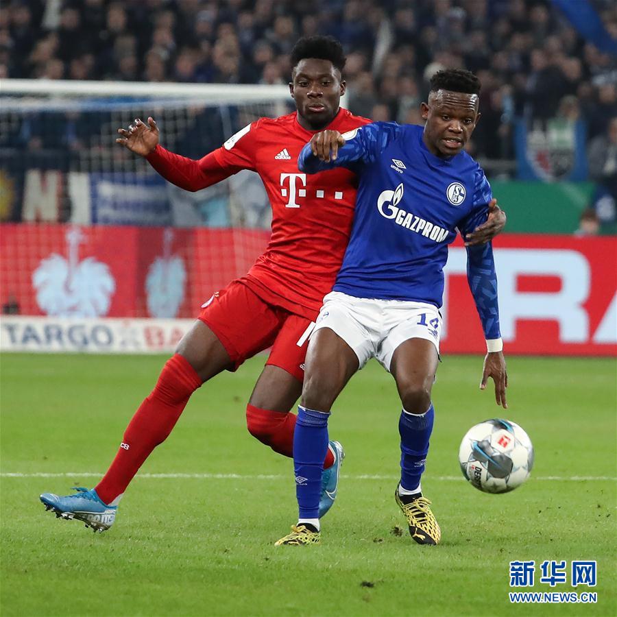 3月3日,拜仁慕尼黑队球员戴维斯(左)在比赛中与沙尔克04队球员马东多拼抢。 当日,在德国盖尔森基兴举行的2019-2020赛季德国杯足球赛四分之一决赛中,拜仁慕尼黑队客场以1比0战胜沙尔克04队,晋级半决赛。 新华社发(约阿希姆·毕瓦勒兹摄)