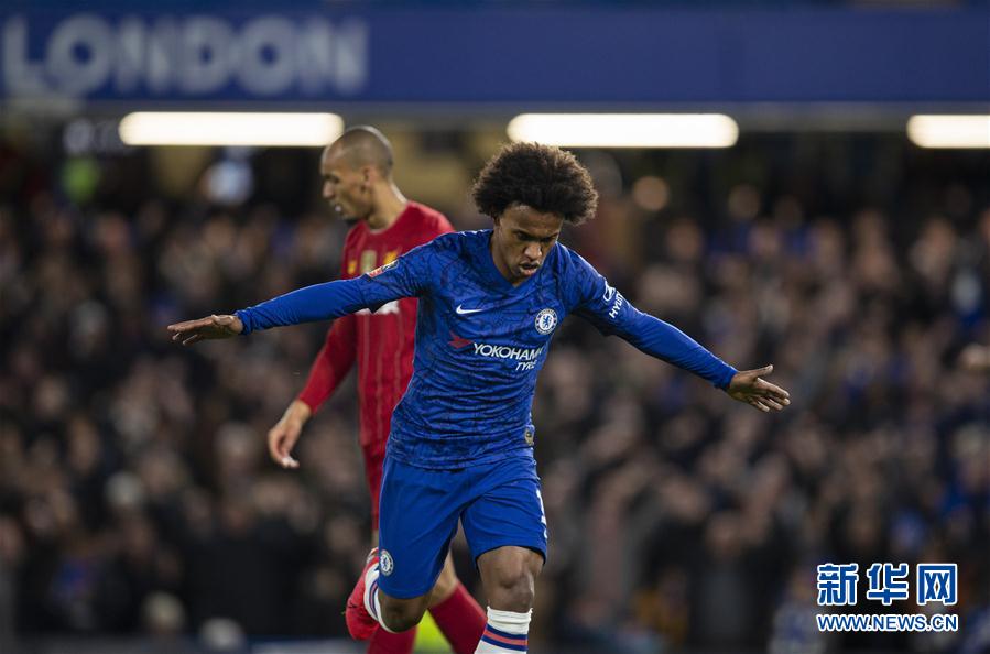 3月3日,切尔西队球员威廉庆祝进球。 当日,在英国伦敦进行的英格兰足总杯第五轮比赛中,切尔西队主场以2比0战胜利物浦队。 新华社发