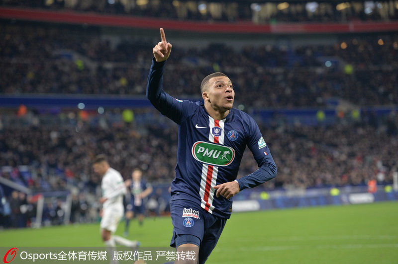 人民网北京3月5日电 北京时间3月5日凌晨4时10分,2019-2020赛季法国杯半决赛展开首场争夺,巴黎圣日耳曼客场挑战里昂。上半时,泰利耶推射破门为主队首开纪录,随后姆巴佩捅射破门扳平比分,卡瓦尼中场结束前抽射中柱;下半时,姆巴佩传中造点,马萨尔累积两黄被罚下场,随后内点射命中改写比分,姆巴佩单刀破门扩大领先优势,萨拉维亚远射破门锁定胜局,姆巴佩终场结束前再度破门上演帽子戏法。全场比赛结束,巴黎5-1逆转里昂晋级决赛。