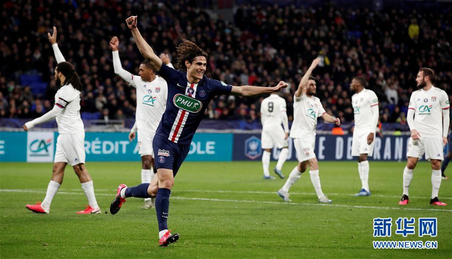 3月4日,巴黎圣日耳曼队球员卡瓦尼(前)在比赛中庆祝进球,该进球稍后被判无效。 当日,在2019-2020赛季法国杯足球赛半决赛中,巴黎圣日耳曼队客场以5比1战胜里昂队,晋级决赛。 新华社/路透