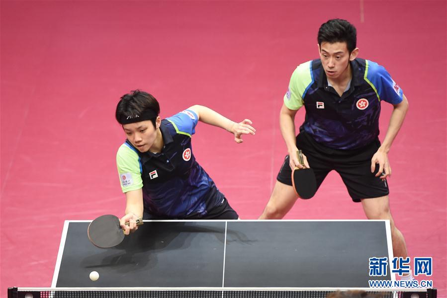 3月5日,黄镇廷/杜凯琹(左)在比赛中。 当日,在多哈举行的2020年国际乒联世界巡回赛卡塔尔公开赛混双首轮的比赛中,中国选手王楚钦/孙颖莎以3比0战胜中国香港选手黄镇廷/杜凯琹,晋级下一轮。 新华社发(尼库摄)