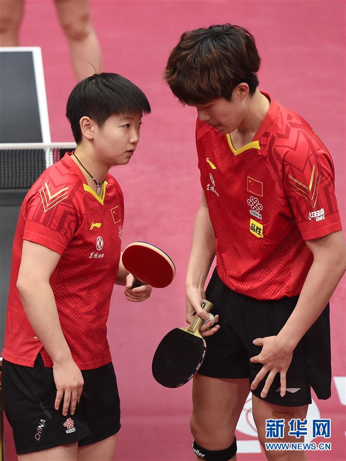 3月5日,王楚钦/孙颖莎(左)在比赛中交谈。 当日,在多哈举行的2020年国际乒联世界巡回赛卡塔尔公开赛混双首轮的比赛中,中国选手王楚钦/孙颖莎以3比0战胜中国香港选手黄镇廷/杜凯琹,晋级下一轮。 新华社发(尼库摄)