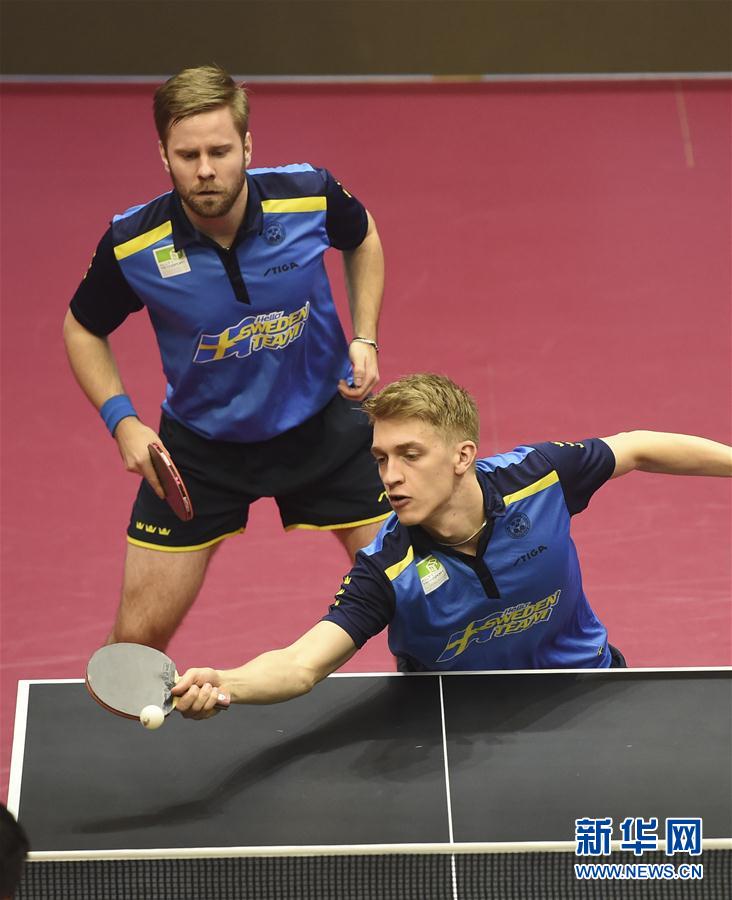 3月5日,科尔贝里/佩尔松(左)在比赛中。 当日,在2020年国际乒联世界巡回赛卡塔尔公开赛男双首轮的比赛中,中国选手马龙/许昕以3比0战胜瑞典选手科尔贝里/佩尔松,晋级下一轮。 新华社发(尼库摄)