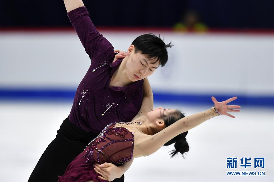 3月5日,中国组合王慧蒂(下)/贾梓麒在双人滑自由滑比赛中。 当日,在爱沙尼亚首都塔林举行的国际滑联世界青年花样滑冰锦标赛双人滑比赛中,中国组合王慧蒂/贾梓麒以148.87分的成绩获得第九名。 新华社发(谢尔盖·斯捷潘诺夫摄)