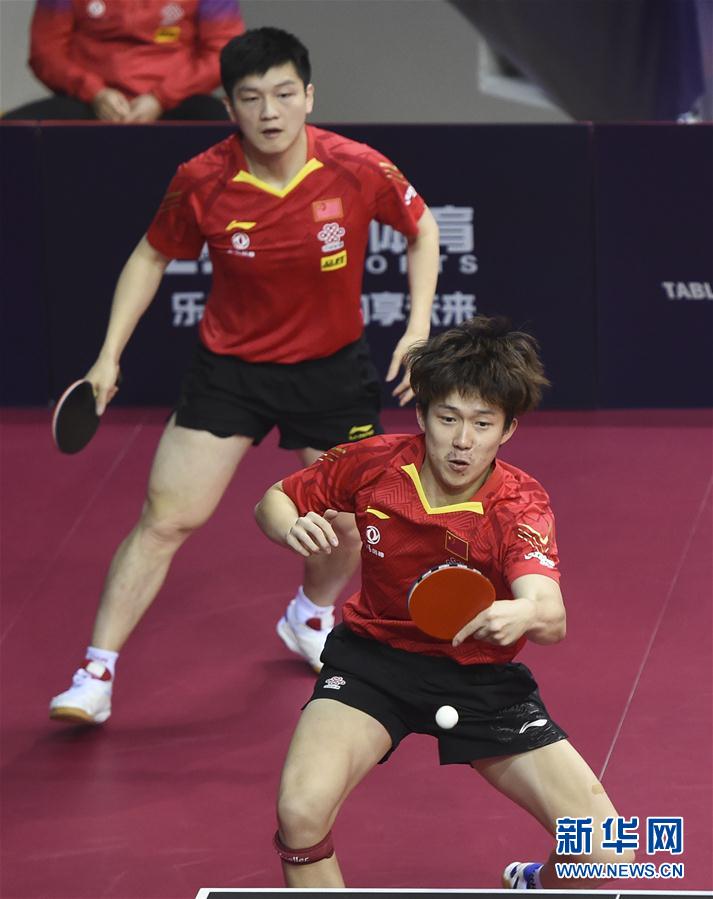 3月5日,樊振东(左)/王楚钦在比赛中。 当日,在2020年国际乒联世界巡回赛卡塔尔公开赛男双首轮的比赛中,中国选手樊振东/王楚钦以3比0战胜卡拉卡舍维奇(塞尔维亚)/皮什泰(斯洛伐克)组合,晋级下一轮。 新华社发(尼库摄)