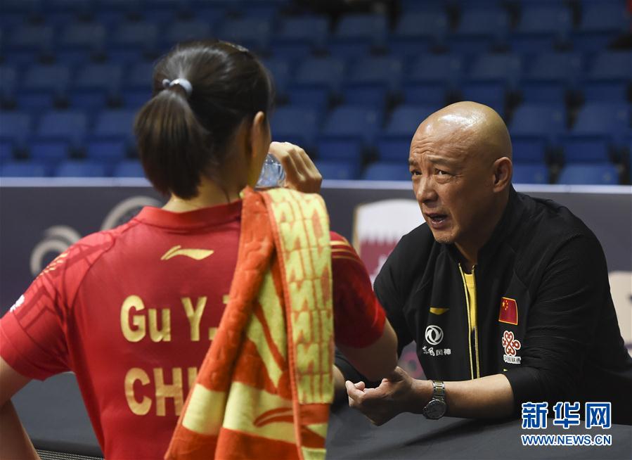 3月5日,顾玉婷(左)在比赛中接受教练肖战指导。 当日,在2020年国际乒联世界巡回赛卡塔尔公开赛女单首轮的比赛中,中国选手顾玉婷以1比4不敌日本选手伊藤美诚,无缘下一轮。 新华社发(尼库摄)