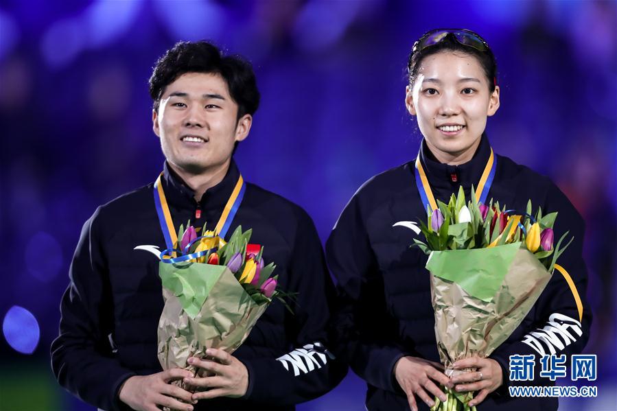 3月8日,中国选手李奇时(右)和阿勒玛斯·卡汉拜在颁奖仪式上。 当日,在荷兰海伦芬举行的2019-2020赛季国际滑联速度滑冰世界杯总决赛男女混合接力表演赛中,中国选手李奇时/阿勒玛斯·卡汉拜以2分58秒54的成绩获得冠军。 新华社记者张铖摄