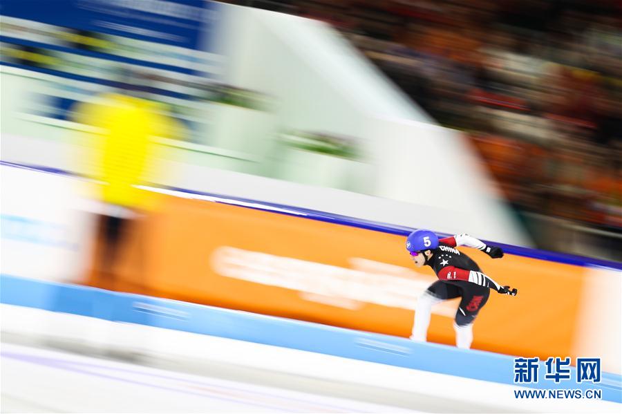 3月8日,中国选手阿勒玛斯·卡汉拜在比赛中。 当日,在荷兰海伦芬举行的2019-2020赛季国际滑联速度滑冰世界杯总决赛男女混合接力表演赛中,中国选手李奇时/阿勒玛斯·卡汉拜以2分58秒54的成绩获得冠军。 新华社记者郑焕松摄