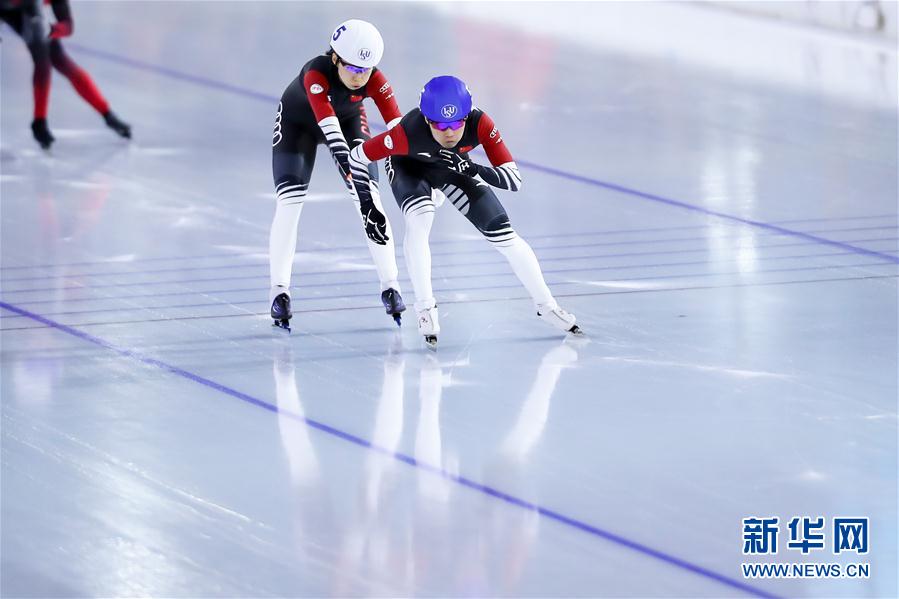 3月8日,中国选手李奇时(后)和阿勒玛斯·卡汉拜在比赛中。 当日,在荷兰海伦芬举行的2019-2020赛季国际滑联速度滑冰世界杯总决赛男女混合接力表演赛中,中国选手李奇时/阿勒玛斯·卡汉拜以2分58秒54的成绩获得冠军。 新华社记者张铖摄