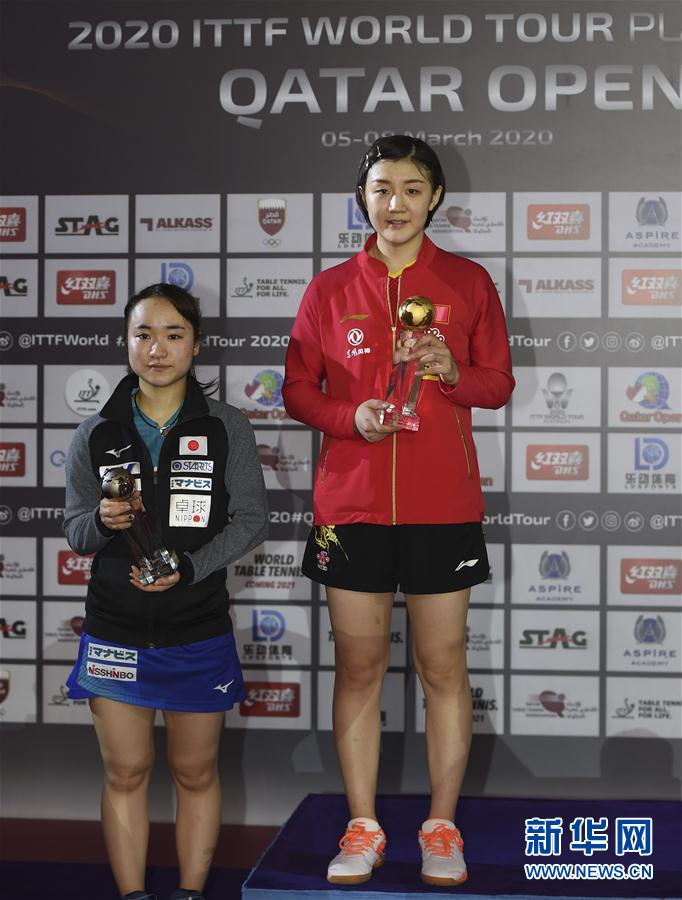 3月8日,陈梦(右)和伊藤美诚在颁奖仪式上。 当日,在卡塔尔多哈举行的2020年国际乒联世界巡回赛卡塔尔公开赛女单决赛中,中国选手陈梦以4比1战胜日本选手伊藤美诚,夺得冠军。 新华社发(尼库摄)