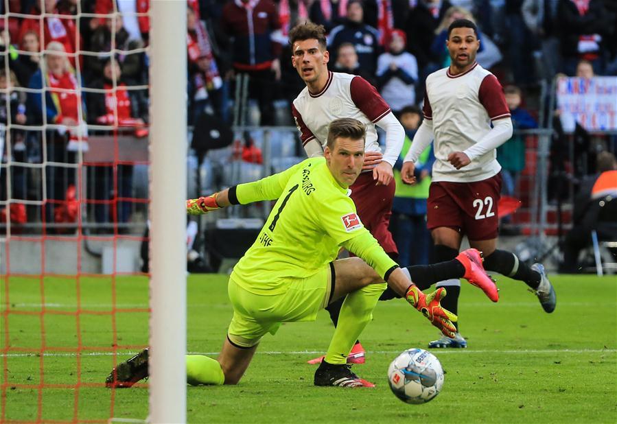 3月8日,拜仁慕尼黑队球员格雷茨卡(上左)在比赛中射门得分。 当日,在2019-2020赛季德国足球甲级联赛第25轮比赛中,拜仁慕尼黑队主场以2比0战胜奥格斯堡队。 新华社发(菲利普·鲁伊兹摄)