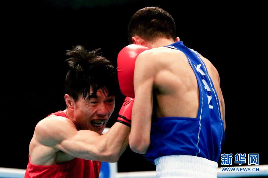 3月9日,胡建关(左)与比博西诺夫在比赛中。 当日,在约旦安曼举行的2020年东京奥运会拳击亚洲大洋洲区资格赛男子48-52公斤级四分之一决赛,中国选手胡建关战胜哈萨克斯坦选手比博西诺夫,晋级四强,并获得东京奥运会参赛席位。 新华社发(穆罕默德·阿布·古什摄)