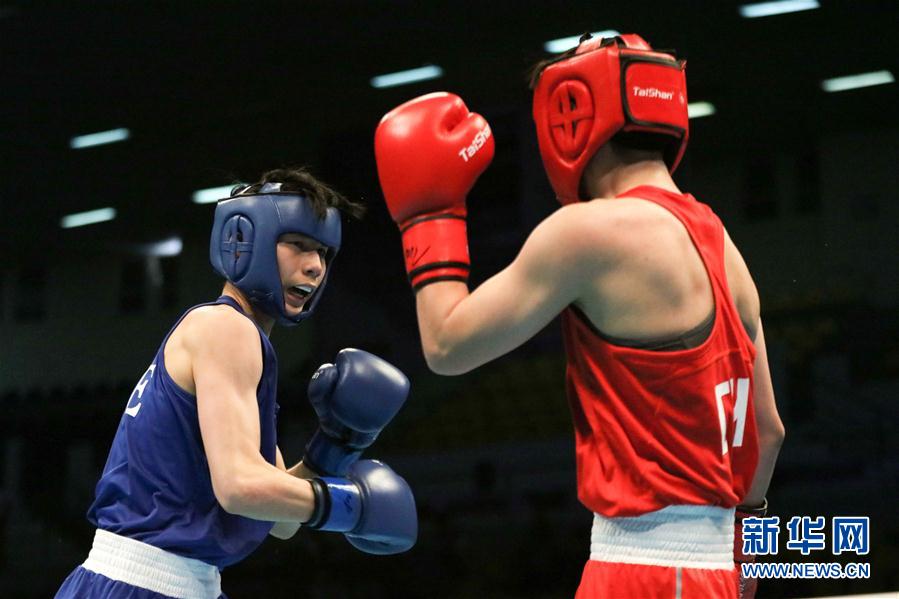 3月9日,尹军花与林郁婷(左)在比赛中。 当日,在约旦安曼举行的2020年东京奥运会拳击亚洲大洋洲区资格赛女子54-57公斤级四分之一决赛中,中国选手尹军花负于中国台北选手林郁婷。 新华社发(穆罕默德·阿布·古什摄)