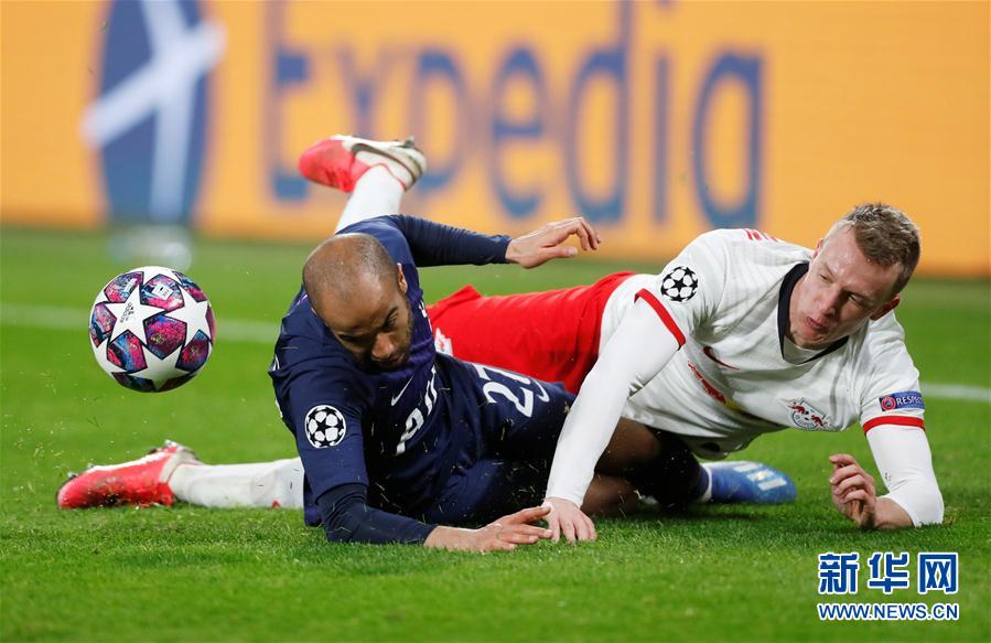 3月10日,莱比锡队球员克洛斯特曼(右)和热刺队球员莫拉拼抢。 当日,在2019-2020赛季欧洲足球冠军联赛八分之一决赛次回合比赛中,英超托特纳姆热刺队客场以0比3不敌德甲莱比锡队,从而以总比分0比4无缘八强。 新华社/路透