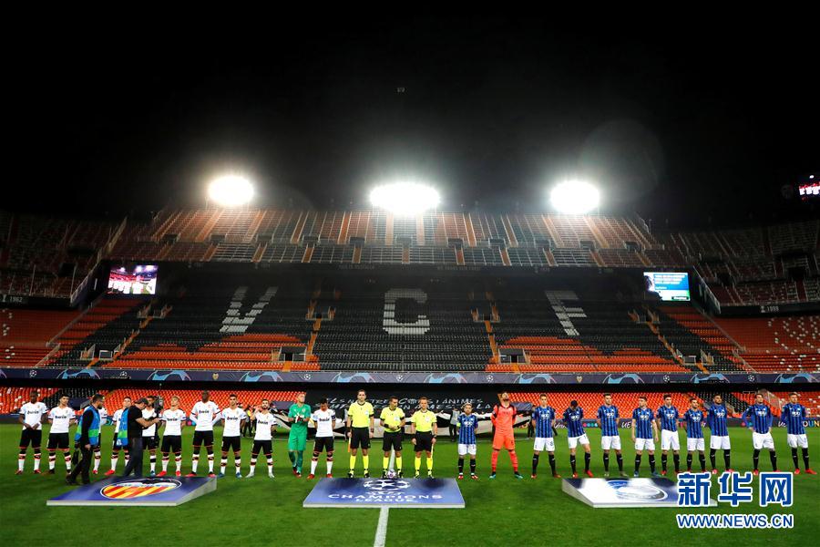 3月10日,两队首发球员和裁判在比赛开始前列队。受新冠肺炎疫情影响,本场比赛空场进行。 当日,在2019-2020赛季欧洲足球冠军联赛八分之一决赛次回合比赛中,意甲亚特兰大队客场以4比3战胜西甲巴伦西亚队,以8比4的总比分晋级八强。 新华社/路透