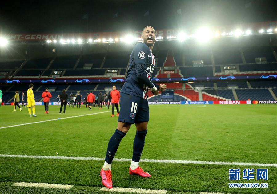3月11日,巴黎圣日耳曼队球员内马尔赛后庆祝胜利。 当日,在2019-2020赛季欧洲足球冠军联赛八分之一决赛第二回合比赛中,法甲巴黎圣日耳曼队主场以2比0战胜德甲多特蒙德队,从而以总比分3比2晋级八强。 新华社/路透