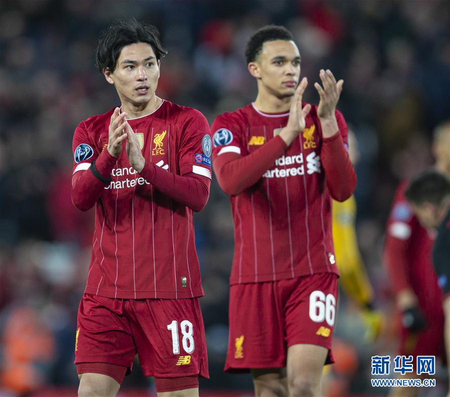 3月11日,利物浦队球员南野拓实(左)与阿诺德赛后向球迷致意。 当日,在2019/2020赛季欧洲足球冠军联赛八分之一决赛第二回合比赛中,英超利物浦队主场通过加时赛以2比3不敌西甲马德里竞技队,从而以总比分2比4遭淘汰,无缘八强。 新华社发