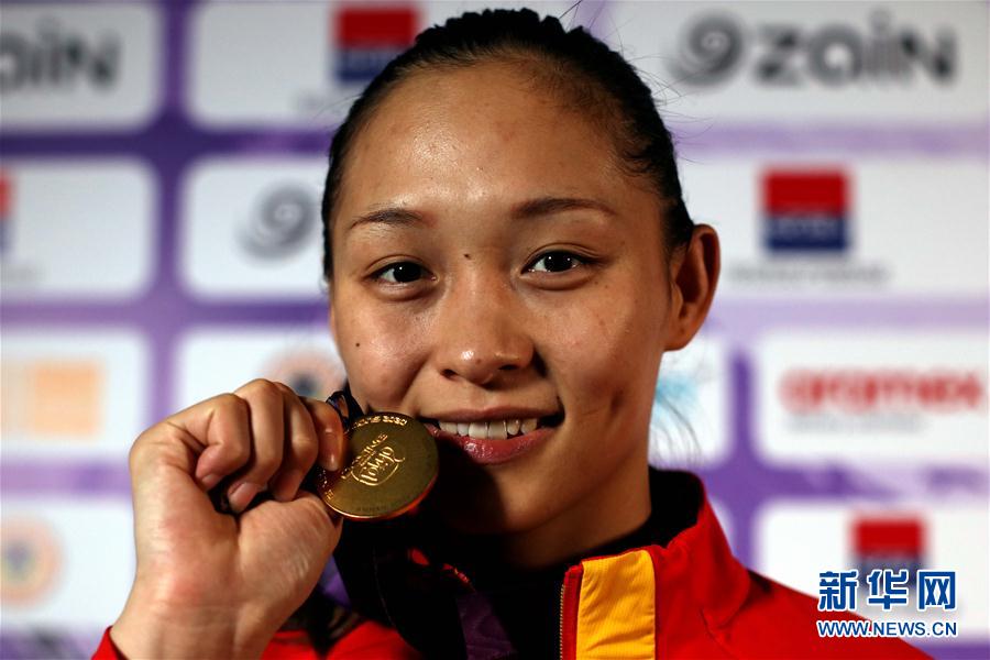 3月11日,常园展示金牌。 当日,在约旦安曼举行的2020年东京奥运会拳击亚洲大洋洲区资格赛女子48-51公斤级决赛中,已获东京奥运会参赛资格的中国选手常园战胜日本选手并木月海,获得金牌。 新华社发(穆罕默德·阿布·古什摄)