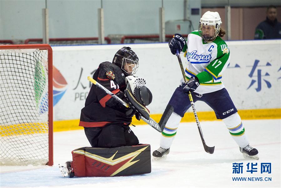 3月11日,深圳昆仑鸿星万科阳光队守门员诺拉·莱缇(左)在比赛中防守。 当日,在2019-2020赛季俄罗斯女子冰球联赛总决赛第三场比赛中,深圳昆仑鸿星万科阳光队以4比2战胜卫冕冠军乌法队,从而以3比0的总比分横扫对手,夺得总冠军。 新华社发(深圳队官方供图)