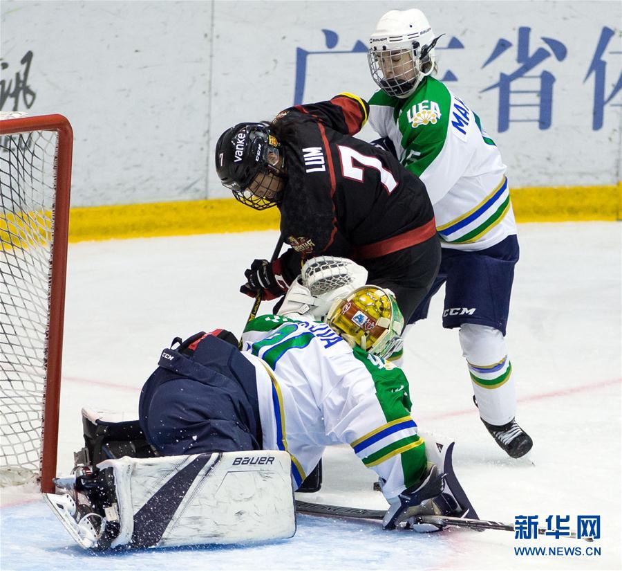 3月11日,深圳昆仑鸿星万科阳光队队员林绮琪(中)在比赛中进攻。 当日,在2019-2020赛季俄罗斯女子冰球联赛总决赛第三场比赛中,深圳昆仑鸿星万科阳光队以4比2战胜卫冕冠军乌法队,从而以3比0的总比分横扫对手,夺得总冠军。 新华社发(深圳队官方供图)
