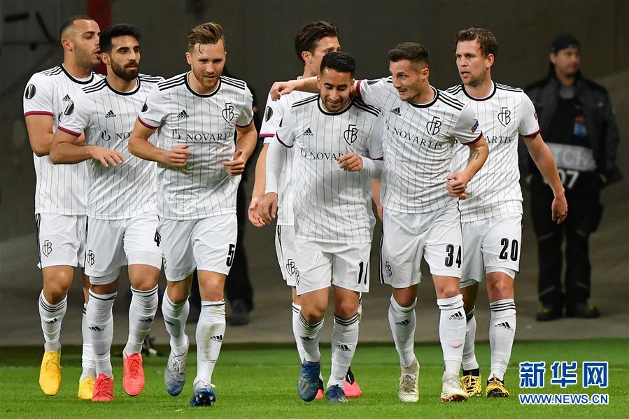 3月12日,巴塞尔队球员坎波(右三)在进球后和队友庆祝。 当日,在德国法兰克福举行的2019-2020赛季欧罗巴联赛八分之一决赛首回合比赛中,德甲法兰克福队主场以0比3不敌瑞超巴塞尔队。 新华社发(乌尔里希·胡夫纳格尔 摄)