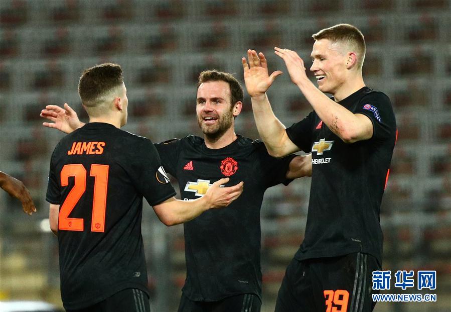 3月12日,曼联队球员詹姆斯(左)在进球后和队友庆祝。 当日,在奥地利林茨举行的2019-2020赛季欧罗巴联赛八分之一决赛首回合比赛中,英超曼彻斯特联队客场以5比0战胜奥超林茨队。 新华社/路透
