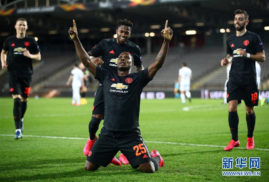 3月12日,曼联队球员伊哈洛(前)庆祝进球。 当日,在奥地利林茨举行的2019-2020赛季欧罗巴联赛八分之一决赛首回合比赛中,英超曼彻斯特联队客场以5比0战胜奥超林茨队。 新华社/路透
