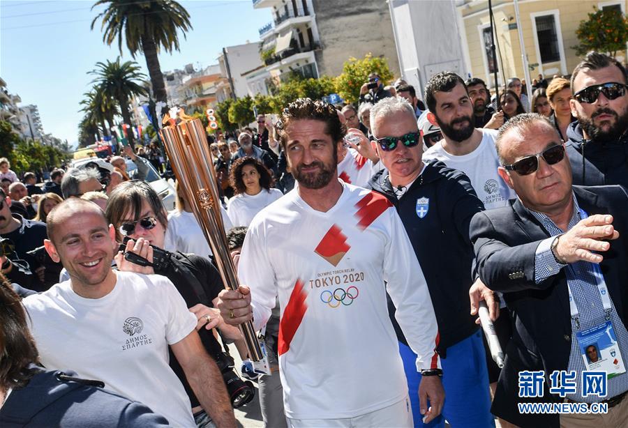 3月13日,演员杰拉德·巴特勒(前中)在希腊城镇斯巴达传递火炬时吸引了大批围观群众。新华社/法新