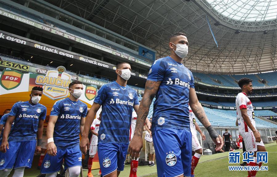 3月15日,佩戴口罩的格雷米奥队球员在比赛前出场。 当日,在巴西州联赛格雷米奥对阵圣路易斯的闭门赛中,格雷米奥队球员戴口罩参加赛前开场仪式。巴西足协15日决定,从16日起巴西国内所有全国性足球比赛将无限期暂停。巴西足协主席罗杰里奥·卡波克洛说:“我们的做法是在足球界承担起防止新冠病毒在巴西扩散的责任。”巴西足协同时表示将与卫生部保持密切联系,希望国家能够尽快战胜这一挑战,体育比赛能够尽早恢复正常。 新华社/法新