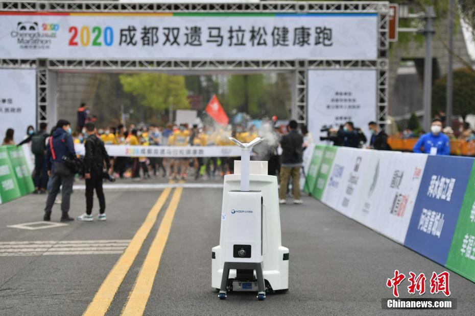 3月22日,2020成都“双遗”马拉松健康跑在成都市都江堰市青城山鸣枪起跑。图为智能机器人现场喷雾消毒。张浪 摄