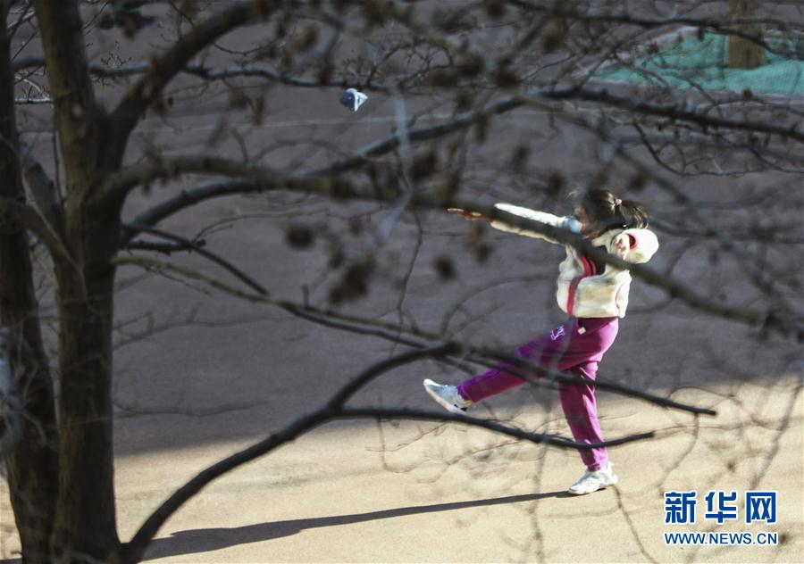 春天来临,天气转暖,随着疫情防控形势向好,北京市西城区香炉营东巷某小区的居民纷纷走出家门,以各种方式锻炼身体,强健体魄,享受春光。 这是一个小朋友在和同伴一起玩“砍沙包”游戏(3月15日摄)。 新华社记者 兰红光 摄
