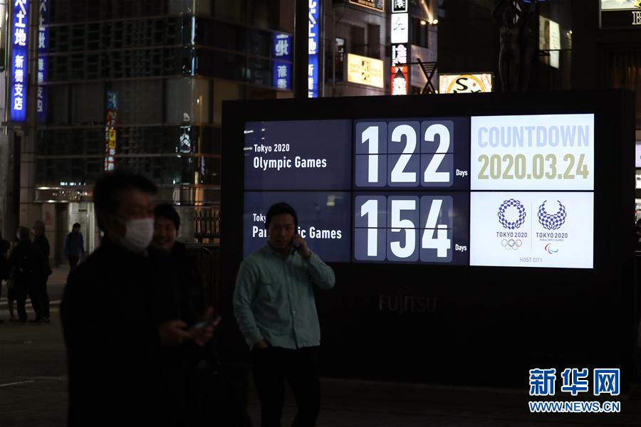 3月24日,受新型冠状病毒肺炎全球疫情影响,国际奥委会与东京奥组委发表联合声明,东京第32届奥运会将改期至2020年后,但不迟于2021年夏天的日期举行。 这是3月24日,行人经过日本东京新桥地区显示东京奥运会和残奥会倒计时天数的电子屏。 新华社记者杜潇逸摄