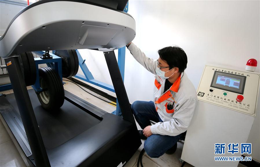 这是工作人员在廊坊夏垫佳美体育用品有限公司对跑步机单轮胎进行疲劳测试(3月23日摄)。 为积极指导体育企业复工复产,本月初河北省体育局制定下发《新型冠状病毒肺炎疫情期间公共体育场馆和体育运动项目经营单位防控指引》,鼓励体育用品制造和销售企业新产品、新技术的研发,培育体育消费新热点。 新华社发