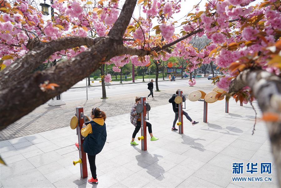3月31日,市民在西安曲江新区一处广场上锻炼。 近日,陕西西安曲江新区一些广场和街道樱花盛开,成为市民健身休闲的好去处。 新华社记者 邵瑞 摄