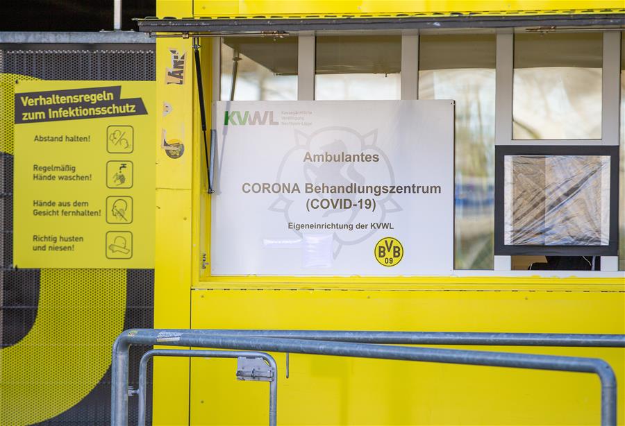 4月3日,德甲多特蒙德俱乐部宣布,俱乐部主场西格纳伊度纳公园球场将改造成当地的新冠肺炎病毒临时检测中心,从4日开始接待检测。多特与当地健康保险医师协会共同将球场北看台改造成检测中心,投入使用后,每天中午12点到下午4点接待检测。西格纳伊度纳公园球场是德国最大的专业足球场,可容纳81365位观众,在德甲停摆期间一直闲置,其南看台是享誉欧洲足坛的“黄墙”(可容纳2万人的站立区)。 新华社发(约阿希姆·毕瓦勒兹摄)