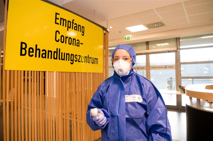 在德国多特蒙德西格纳伊度纳公园球场,一名身穿防护装备的医护人员在新冠肺炎病毒临时检测中心内工作(4月3日摄)。新华社发(亚历山大·西蒙斯摄)